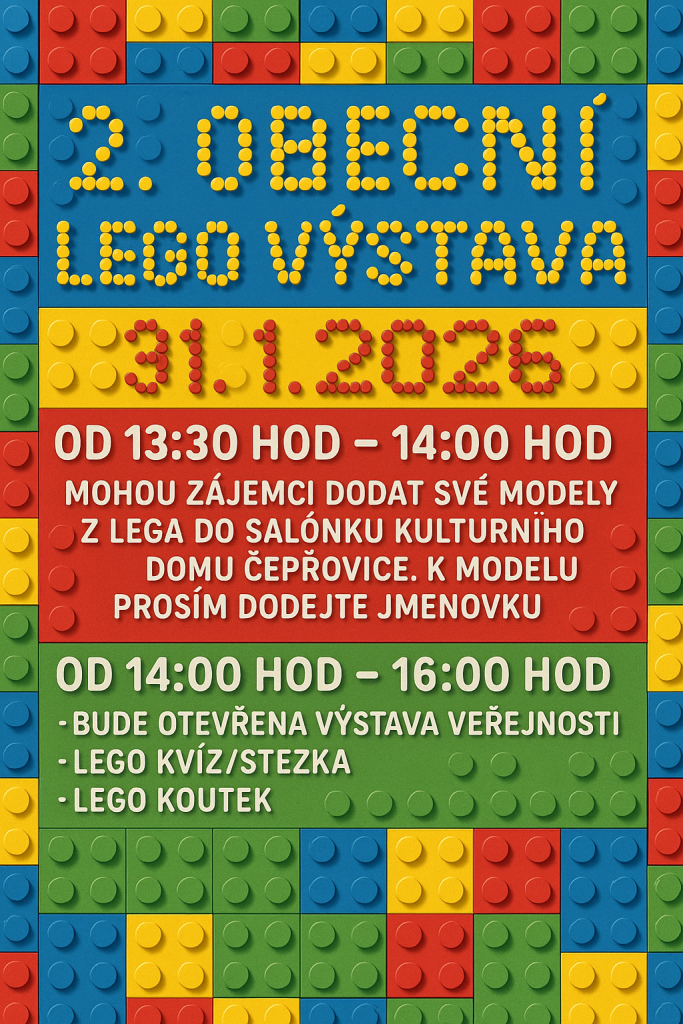 jak jistě možná víte, na 28. 1. připadá mezinárodní den Lega. No a protože máme v obci a v okolí určitě mnoho milovníků lega, rozhodla se obec uspořádala v sobotu 31. 1. 2026 ,,Obecní Lego výstavu”.